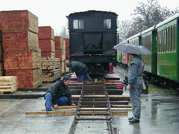 Um die Lok vom Tieflader zu bekommen, wurde schnell eine Rampe gebaut.. |