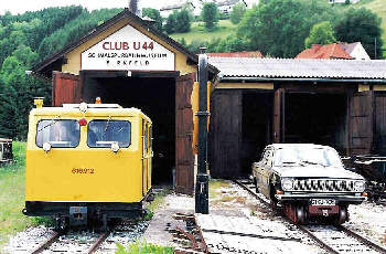 Freunden der Thörlerbahn sicher bekannt, die gelbe Draisine, hier mit dem Wolga am Haken.