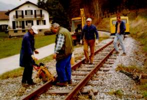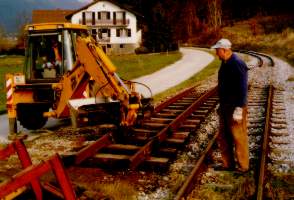 Einbau der SchutzweicheHallo Oskar! Ich möchte Dir als Clubmitglied und Lokführer auf der Feistritztalbahn vier Bilder vom Einbau der Schutzweiche am 05.04.2002 im km 11.870 bei Oberfeistritz zur weiteren Verwendung zusenden. Zwei Bilder zeigen die Demontage von 15 m Streckengleis, das anschließend als Stumpfgleis verwendet wurde, die beiden anderen Bilder den bereits fertigen Zustand vom 17.04.2002. Mit freundlichem Gruß, Walter Schörkmayer ![]() ![]() ![]() ![]() | ||||||||||||||||||||||||