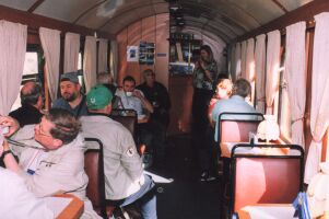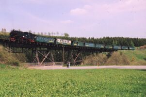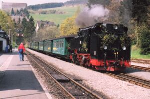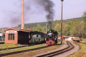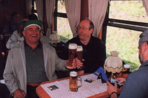 Fichtelbergbahn, bis die Oma abwinktDonnerstag, Himmerfahrt, Vatertag, oder wie es in Sachsen heißt: Männertag. Die Lokomotiven waren geschmückt, oder wie wir schwadronierten: getarnt, daß sie von den Frauen nicht gesehen werden: Dieser Tag war nicht verplant, sondern stand jedermann zur freien Verfügung. Während die meisten nach Annaberg-Buchholz fuhren, um dieses sehenswerte Städtchen zu besichtigen beschlossen die ganz harten: Fichtelbergbahn bis zum Abwinken! Der schönste Platz im Zug ist zweifelsohne auf der Lok, doch wo ist der zweitschönste? Richtig, im Buffetwagen! Und dort wurden wir von dieser netten Dame bedient. Als sie in einem der Bahnhöfe ihr Enkelkind begüßte, hatte sie ihren Spitznamen weg: "Die Oma". So ging es erst mal mit der gesamten Mannschaft nach Cramzahl. Eine Gelegenheit, die wir nutzten, um erst mal die gesamten Weizenbiervorräte (32 echte Steirer sind da durchaus leistungsfähig!) unserer Oma zu vernichten: In Cranzahl fuhren die meisten weiter nach Annaberg-Buchholz, und nur die ganz harten Fans blieben im Zug. Und fuhren zurück zur anderen Endstation: Oberwiesenthal. Die Wartezeit, bis der Zug wieder nach unten startete, war für uns eine willkommene Gelegenheit, sich am Bahnhof umzuschauen: Die blaue rumänische Dielellok hatte am Abend noch die Ehre, nach einem technischen Defekt bei einer der Dampfer, unsere Vereinsfreunde wieder heimzufahren... Anschließend ging es wieder zurück nach Hammerunterwiesenthal, und dann (ist doch gut, wenn man ein großes Auto hat...) mit meinem Kleinbus wieder zurück nach Oberwiesenthal. Dort ging es erst mal zu Fuß nach Tschechien, am Vietnamesenmarkt vorbei zu einem Gasthaus, wo wir sehr gut und preiswert zu Mittag aßen. Übrigens, der Grenzübertritt war mehr als problemlos, nicht einmal der Personalausweis wurde verlangt. Frisch gestärkt ging es dann wieder nach Oberwiesenthal, zu der schönen Brücke kurz vor dem Bahnhof, wo folgende Bilder entstanden: Dann ging es wieder zurück nach Hammerunterwiesenthal. Nun konnte auch ich mein Auto abstellen und sehnte mich nach einem wunderbaren kühlen Krügerl. Dampfer-fahren macht durstig! Doch was macht man mit so einem angefangenen Nachmittag? Richtig: Eisenbahnfahren. Aber bis zum nächsten Zug dauerte es noch zwei Stunden. Unsere Wirtschaft war wieder zu, und selbst 9 durstige Steirer konnten unsere Wirtin nicht zu einem Bierverkauf überreden. Und wir bekamen wieder den Hinweis, daß es keine andere Wirtschaft im Ort gibt. Gemäß dem Motto, lieber suchen als dürsten gingen wir dennoch selbst auf die Suche und fanden schließlich ca 300m entfernt eine sehr nette Wirtschaft und konnten dort, bestens bewirtet, die Zeit bis zum nächsten Zug überbrücken (ZISCHHHH). Und schließlich kam der Zug, und es war wieder der mit unserer "Oma", die uns inzwischen schon mit Hallo begrüßte. In Cranzahl hatten wir ca. 20 Minuten Aufenthalt, bis der Zug wieder retour nach Hammerunterwiesenthal fuhr, eine Zeit, die unser Zugpersonal zu einer kurzen Rast nutzte (Von links nach rechts: Unsere "Oma", Ihre Kollegin und der Schaffner)... ...während ich die Gelegenheit nutzte, einige schöne Fotos von dem inzwischen verschlafenen, aber dennoch schönen Bahnhof, zu schießen: Auch dieser Tag klang im Quartier mit jeder Menge Gesprächstoff aus und auch unser Walter, der wie immer früh ins Bett wollte, war einer der le... | ||||||||||||||||||||||||