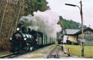 Adventmarkt in BirkfeldAlle Jahre wieder.... veranstalteten wir auch 2006 eine Sonderfahrt von Weiz nach Birkfeld zum hier stattfindenden Adventmarkt. Zum Einsatz kam am 10.12.2006 die Bummelzugsgarnitur mit der aus Bosnien stammende Dampflokomotive 83-180. Im Rahmen des Adventmarktes wurde allerlei Schönes und Gutes aus den Bereichen "Kunst" (Handwerk und Musik) und "Kulinarisches" (steirische Spezialitäten) geboten. Die 83-180 durchfährt mit dem Adventzug den Bahnhof Oberfeistritz.