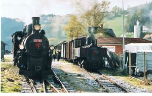 Oktoberfest mit den EdlseernDie Sommersaison mit den planmäßig verkehrenden Zügen endete zwar schon am 22.1.2006, am 26.10.2006 luden jedoch die "Edlseer", eine Volksmusikgruppe, zu ihrem Oktoberfest nach Birkfeld. Mitglieder des Edlseer - Fanclubs füllten den mit der 83-180 bespannten Zug und bejubelten die Musiker, die schon während der Fahrt für die Fahrgäste aufspielten. Nach der Ankunft des "Edlseer - Sonderzugs" hat die 83-180 neben der U 7 Aufstellung genommen, die damals noch in Birkfeld ausgestellt war.Text und Bild: Dietmar Zehetner