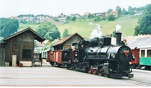 KohletransporteDie während der Sommermonate an vier Tagen pro Woche verkehrenden Touristenzüge zwischen Weiz und Birkfeld sind planmäßig mit einer der beiden Dampfloks bespannt. Die Bekohlung der Dampflokomotiven erfolgt im Bahnhof Birkfeld, wohin die Kohle per Bahn gelangt. Für den Kohletransport sind die beiden Wagen Om/s 511 und Om/s 512 vorhanden, die bei Bedarf den Personenzügen nach Birkfeld beigegeben werden. Während der Wendepause des Personenzugs wird der volle Kohlewaggon gegen den leeren ausgetauscht. Die Verschubfahrten werden mit der vor dem Personenzug eingesetzten Dampflokomotive durchgeführt. Nach der Ankunft des Bummelzuges in Birkfeld ist 83-180 am 23.7.2006 mit dem Verschub eines Kohlewaggons beschäftigtText und Bild: Dietmar Zehetner