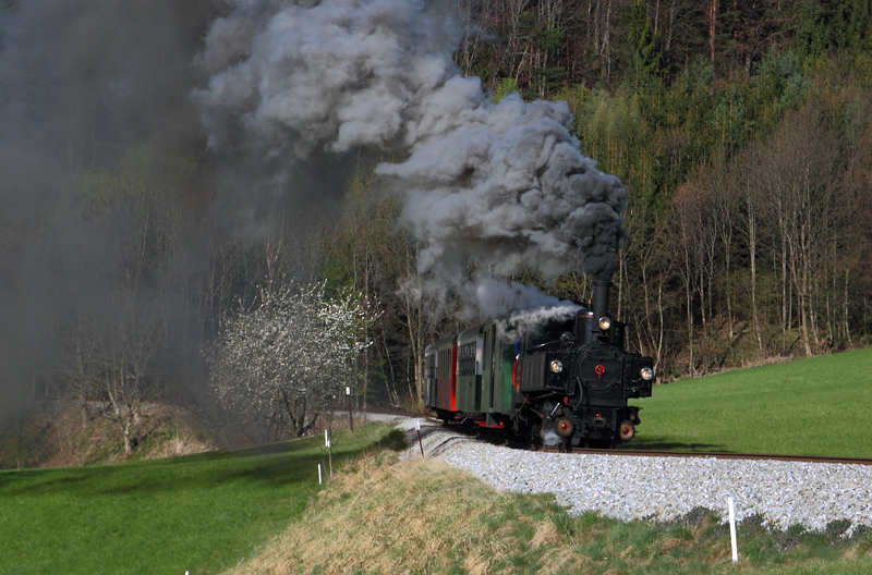 ZB2 ist mit dem Osterhasenkirtagsonderzug zwischen Bachl und dem Grub-Viadukt unterwegs.Foto: Dietmar Zehetner