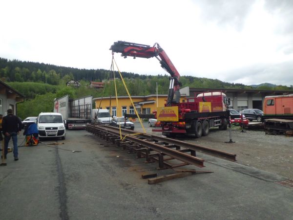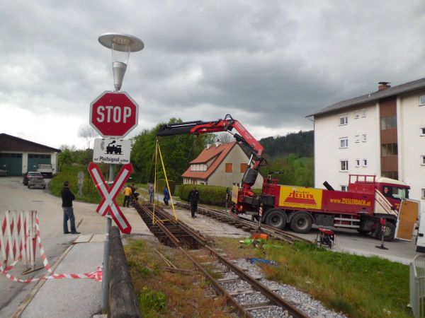 Neue EK in Km 13,875 der FeistritztalbahnBei der alljährlichen Begehung der Strecke Oberfeistritz – Birkfeld durch einen Sachverständigen gem. § 40 EisBG wurden einige schadhafte Stellen am Oberbau der Strecke festgestellt. Es ist ja Tatsache, dass nach einem Betrieb von über 20 Jahren diverse Anlagen eine Grundsanierung verlangen. Heuer musste vorraqngig die Eisenbahnkreuzung in Km 13,875 total erneuert werden. Mit großer Unterstützung durch die Gemeinde Baierdorf und der Fa. TecSol in Anger konnte dieses Vorhaben innerhalb weniger Tage erledigt werden. Das gesamte Gleisstück in der Länge von ca 17 Metern wurde imWerksgelände der Firma TecSol vorgefertigt und mit einem Sattelauflieger zum Einbauort transportiert. Inzwischen wurde die EK abgesperrt. Der Straßenverkehr musste großräumig umgeleitet werden. Der Abbau des alten Gleises und des Erdreiches wurde mit einem Bagger der Gemeinde Baierdorf am 25.4.2014 vorgenommen. Das fertige Gleisstück wurde eingepasst und am Nachmittag konnte bereits betoniert werden. Am nächsten Tag wurde die Straße für den Verkehr wieder freigegeben. Ein großer Dank darf hier der Gemeinde Baierdorf, der Fa. Tecsol und ihren Mitarbeitern und den Mitarbeitern der FTB un d des Club U 44 ausgesprochen werden. Durch das Zusammenwirken aller Beteiligten konnte dieses Projekt in kürzester Zeit abgeschlossen werden.